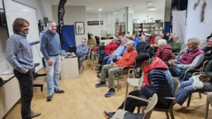 El día estuvo lleno de actividades conjuntas, pues por la mañana realizamos una salida de socios que nos llevó a pisar la cumbre del Torozo, a la que llegamos desde el puerto del Pico. Por la tarde, antes de la firma, Ezequiel Conde dio una conferencia en la que nos hizo partícipes de su profundo conocimiento de los Picos de Europa, aunque al final añadió fotos y anécdotas de otras montañas en las que ha desarrollado su importante historial montañero.