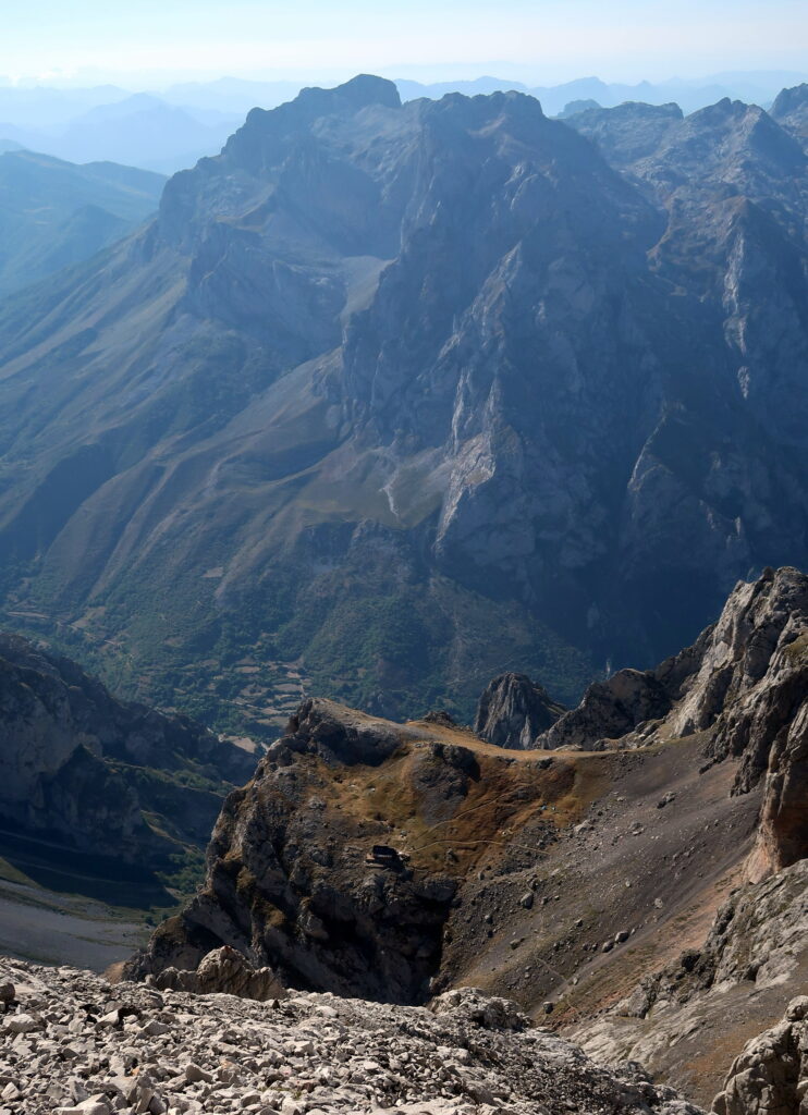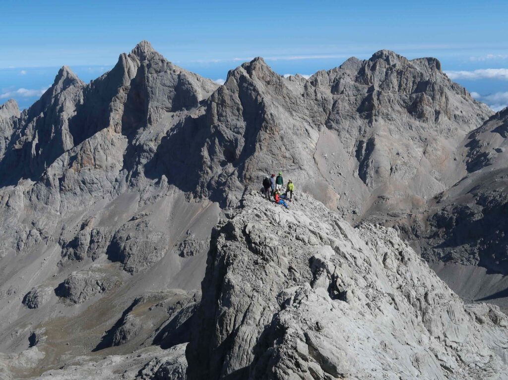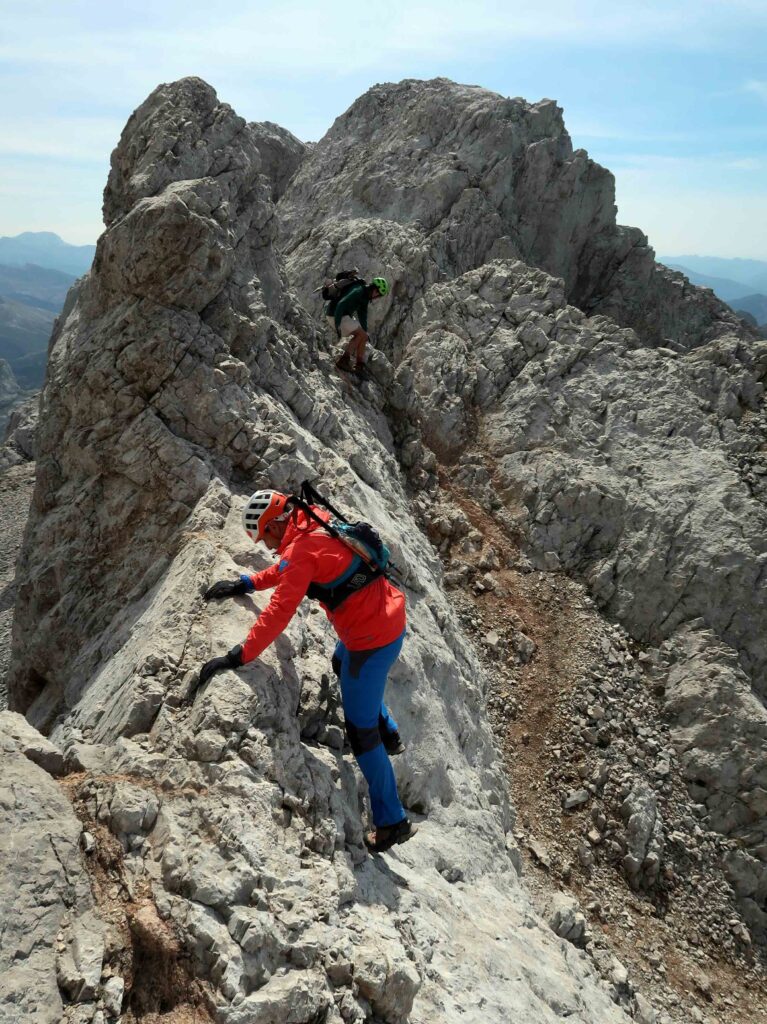 Recuperadas las mochilas, ascendemos desde el collado con cuidado por la arista que conduce a la Torre de Llambrión, a 2642 m, con algunos pasos expuestos que nos obligan a detenernos para atravesarlos con seguridad. Ya en la cumbre paramos para contemplar este paisaje agreste y desnudo, de piedra plateada, desafiante de la gravedad, lleno de espacio y del azul del cielo, que nos hace tomar conciencia de nuestra pequeñez y de la belleza del entorno. Allí abajo, muy abajo, divisamos nuestro pequeño refugio, donde tenemos que volver.