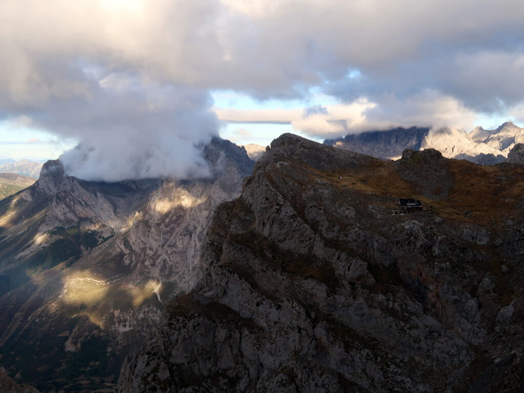 Desde Las Colladinas, el refugio Diego Mella, y la Bermeja y Peña Santa entre nubes
