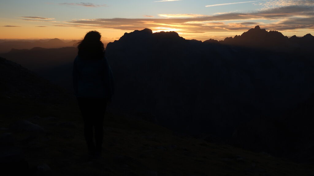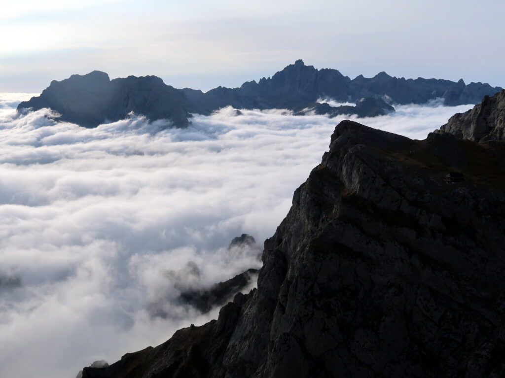 Pero como somos peñalaros y apuramos la montaña hasta donde nos es posible, después de asearnos y cambiarnos de ropa, subimos al collado que asoma detrás del refugio para contemplar el ocaso con el mar de nubes, por encima del cual solo se ven las cresterías de las torres Bermeja y Peña Santa; a nuestra espalda se impone el paredón que nos ha ocupado el día, anaranjado por el sol declinante que a la postre desaparece.