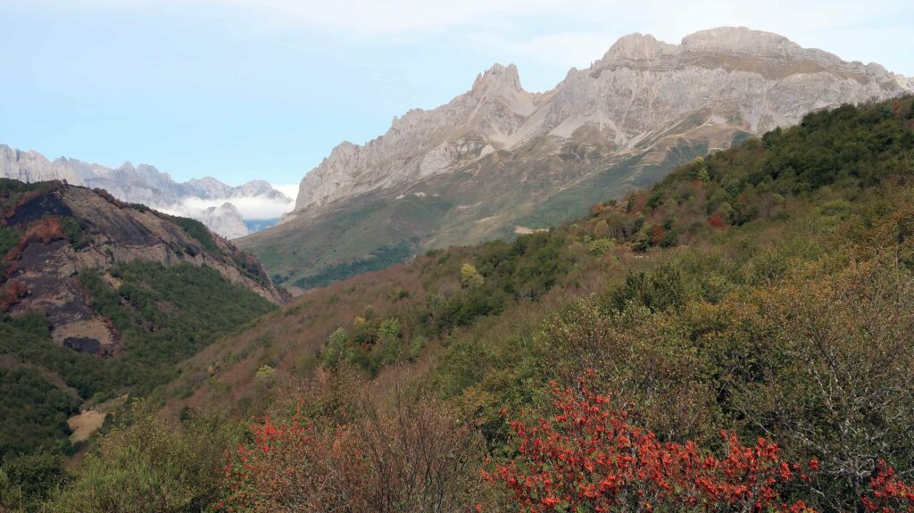 Cuando regresamos al collado, que nos aguarda con la vista de una formidable pared donde vemos gente escalando, nos parece que ya está todo casi terminado; que sólo queda un ratillo para llegar al coche. Pero esa apreciación se desmiente cuando sobrepasamos el collado y, para nuestra sorpresa, tenemos que ascender una loma, a la que sigue una sinuosa y muy empinada bajada hasta llegar con paciencia a un praderío desde el que sale una pista que nos lleva a nuestro destino, que alcanzamos sobre las 17 horas. El día se salda con un ascenso acumulado de 850 m y 1150 m de bajada. Todavía nos cabe la idea de descender hasta Santa María de Valdeón, pero nuestra racionalidad se impune a nuestros deseos, porque tenemos que volver a Madrid, so pena de llegar de madrugada, y la mayoría tenemos que trabajar.