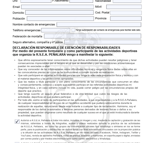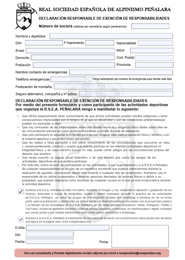 Para poder participar en las actividades organizadas por la RSEA Peñalara, tanto personas socias como no socias, es necesario que envíen mediante correo electrónico, firmado y debidamente cumplimentado, el documento de Exención de Responsabilidad.