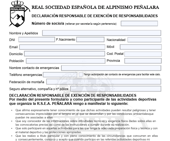 Para poder participar en las actividades organizadas por la RSEA Peñalara, tanto personas socias como no socias, es necesario que envíen mediante correo electrónico, firmado y debidamente cumplimentado, el documento de Exención de Responsabilidad.