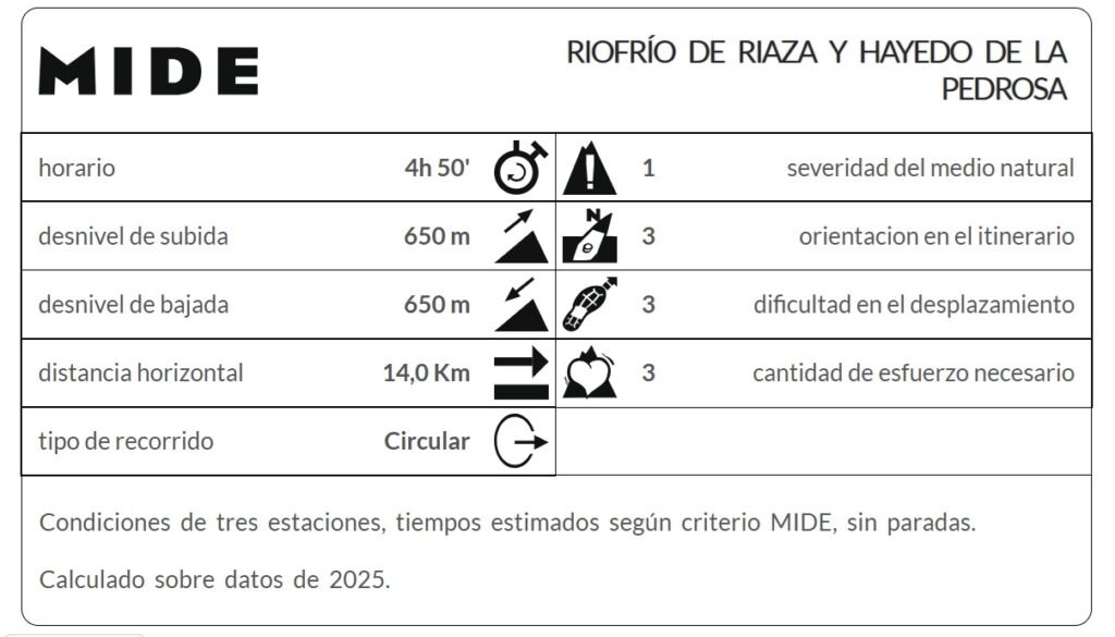 RUTA: Saldremos del pueblo de Riofrío de Riaza donde dejaremos los coches y nos dirigiremos por un camino a la carretera que traíamos desde Riaza alcanzando el km 6 en menos de 1 km. Seguiremos 1 km por la carretera que abandonaremos enseguida, en el km 7, junto a la cola del embalse de Riofrío, para adentrarnos en el bosque de ribera del río Riaza de sin par belleza. Iremos viendo y diferenciando las especies vegetales que salen a nuestro encuentro. Al principio el camino va muy cerca de la orilla atravesando un bosque muy cerrado de roble melojo (Quercus Pirenaica), sin apenas pendiente y con algún que otro vadeo sin ninguna dificultad, salvo la que pudiéramos encontrar en caso de crecida. En seguida iremos ascendiendo, poco a poco y las hayas (Fagus Sylvática) comenzarán a hacer su aparición, hasta internarnos de lleno en el majestuoso Hayedo de la Pedrosa.