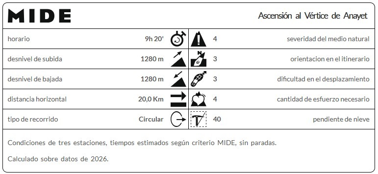 ITINERARIO: Desde el aparcamiento de Anglase se asciende siguiendo el GR‑11 en dirección a Formigal por la Canal Roya. Tras pasar por el refugio de Canal Roya, se alcanza la Rinconada, punto en el que el valle queda cerrado por una gran pared que conduce directamente a los ibones de Anayet (2.233 m). Desde allí nos dirigimos al collado de Anayet para ascender al Vértice de Anayet (2.555 m). Después de regresar al collado, se continúa por la vertiente opuesta a la de ascenso, en dirección a Canfranc.