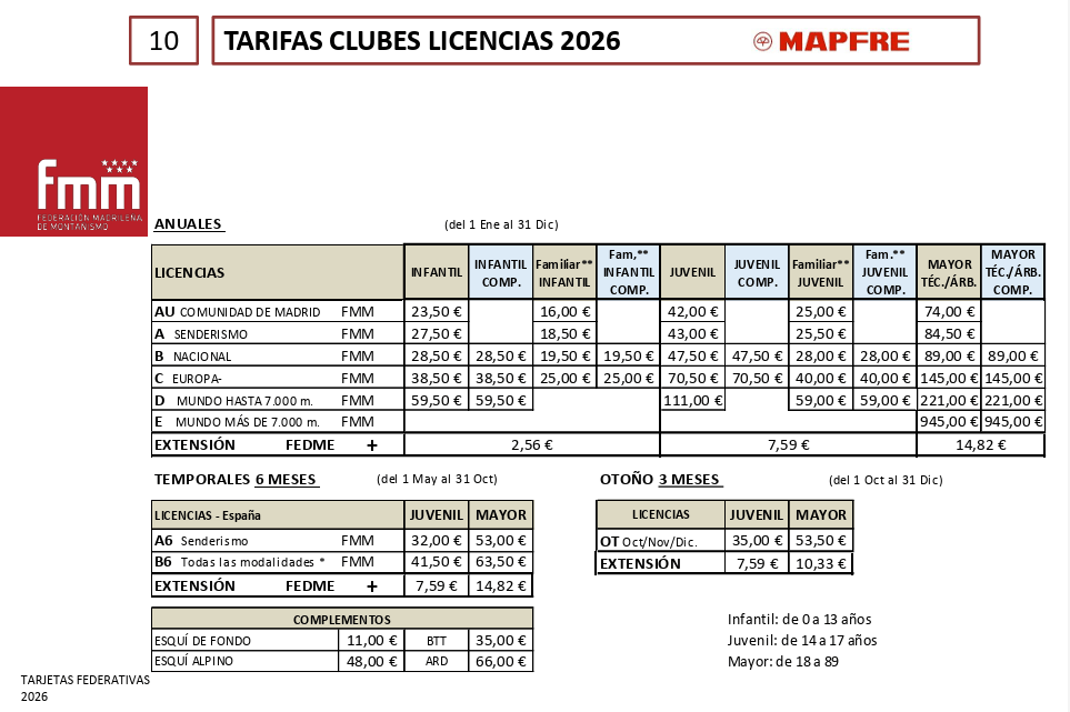 Licencia federativa si vas a competir. Estas licencias están sujetas a cambios legislativos. Lee las condiciones antes de su contratación en el enlace de la FMM.